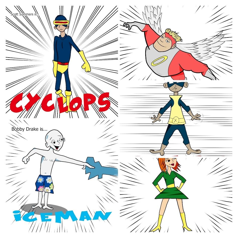Art prints of all five of the original X-Men - Marvel Girl, Cyclops, Beast, Ice Man and Angel.